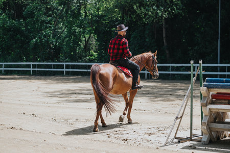 Professional equestrienne exercising hurdle jump on her horse in an outdoor riding arena with obstacles