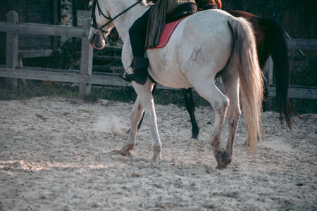 Horseback rider walking seen from the back, in the field on a straw stubble. Horse riding.