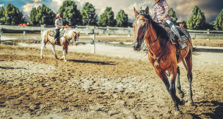 Friends enjoying horse riding and conversation at an outdoor ranch