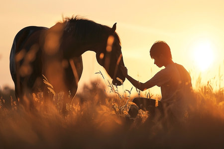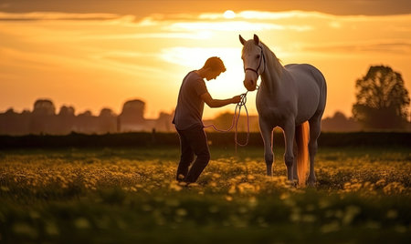 The picture of the cowboy or horse trainer with the horse that has been surrounded with wild nature under the sun at the dawn or dusk time, horse trainer require handling skills and technique. AIG43.