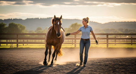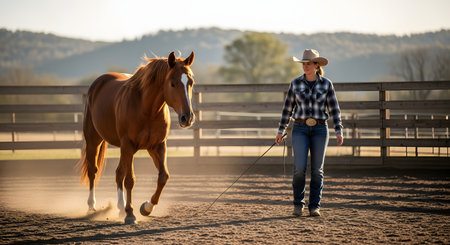 A cowgirl wearing a hat and boots leads a beautiful chestnut horse around a dusty paddock during the golden hour. The warm sunset light illuminates the scene, highlighting the dust kicked up by the horse's hooves. This image captures the bond between human and animal, representing western lifestyle, equestrian training, and ranch life.