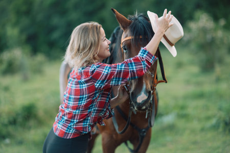 portrait of attractive female equestrian touching and looking at horse at ranch