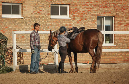 Girl getting ready to ride a horse on a summer day at the stable