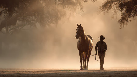 A serene scene of a cowboy walking his horse through a misty landscape at sunrise, capturing the tranquility and bond between human and animal in nature's beauty.