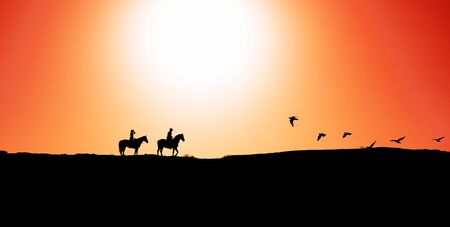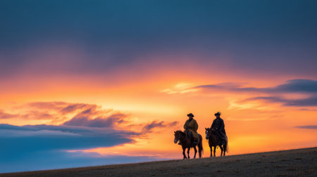 Two equestrian riders on horses relish a serene sunset ride in a beautiful countryside setting.