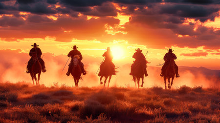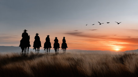 A captivating sunset scene featuring silhouettes of four horsemen against a vibrant sky, evoking a sense of adventure and connection to nature.