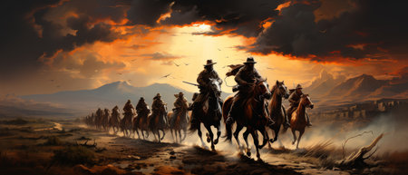 A dramatic scene depicting a cavalry charge at sunset, with riders on horseback galloping through a dusty landscape. The atmosphere is filled with excitement and adventure.