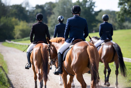 Horseback riding, equestrian sport. Group of young riders on horseback