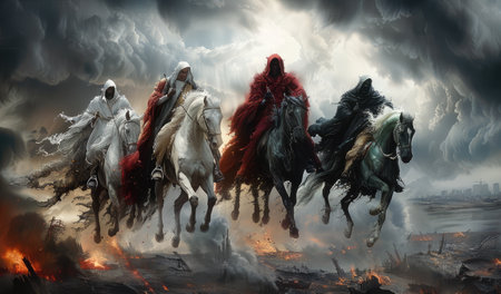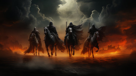 Apocalyptic quartet: 4 horsemen of the apocalypse - the mythical figures symbolizing conquest, war, famine, and death, heralding cataclysmic events