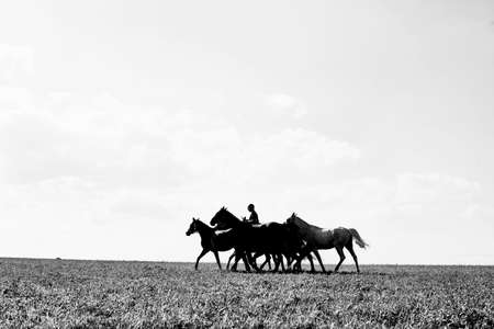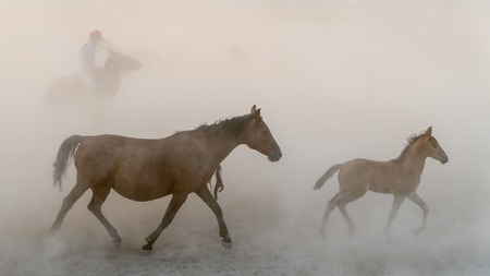 Kayseri, Turkey, August 2017: Horses running gallop n group in dust