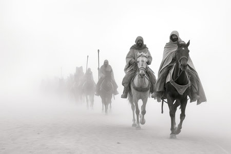 Group of knights templar on horseback charging through the desert sand.