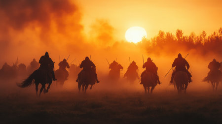 Intense cavalry charge depicted against a vibrant sunset, showcasing dynamic movement and historical elements in a dramatic landscape filled with energy and bravery.