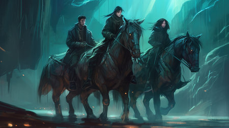 A group of rebels riding on cybernetic horses. Fantasy concept, Illustration painting. Generative AI