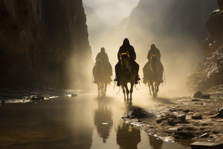 people riding horses on the beach are traditional Mongolian eagle hunter. Generative Ai