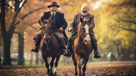 Two elderly people riding horses in a park