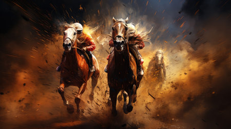 Racing horses in the fire with flames and smoke. Mixed media