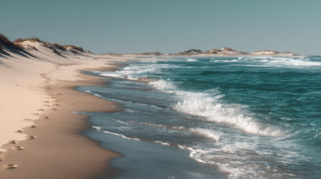 A picturesque beach scene featuring soft sand, gentle waves, and a misty atmosphere. The tranquil environment offers a serene escape into nature's beauty.