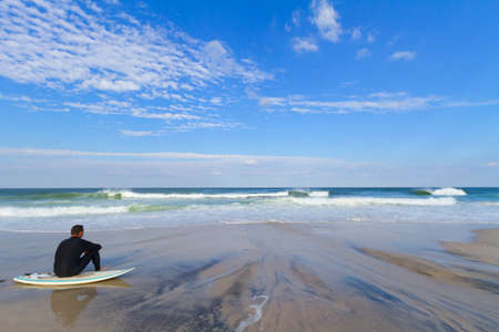 A young man sits alone and takes in the view the beach in Surf City along the Jersey shore