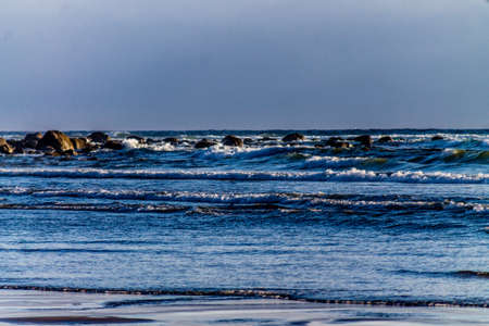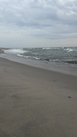 Scenic vista capturing the sandy shore of the Baltic Sea as gentle waves wash up on the beach.