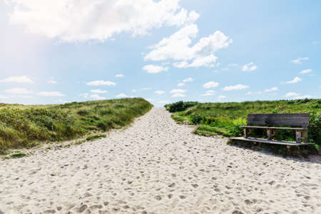 footpath leading to beach in grass covered dunes under blue sky