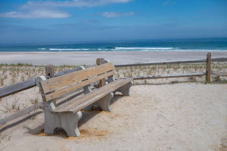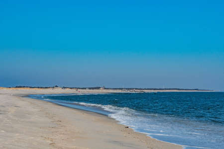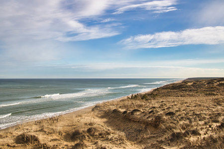 Winter at an empty beach on Cape Cod with sandy dunes and blue sky