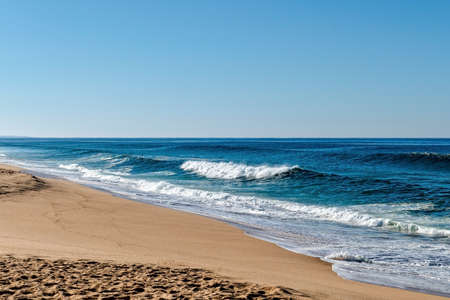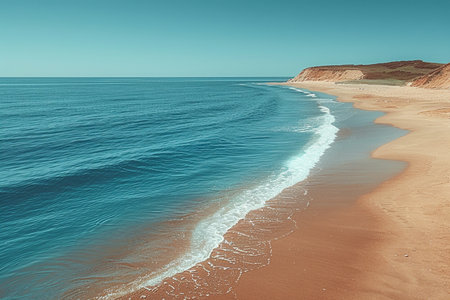 A tranquil seascape featuring the gentle rolling waves of the ocean meeting a sandy beach, stretching towards the horizon under a clear blue sky.