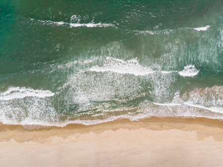 Aerial view sandy beach and waves Beautiful tropical sea in the morning summer season image by Aerial view drone shot, high angle view Top down sea waves