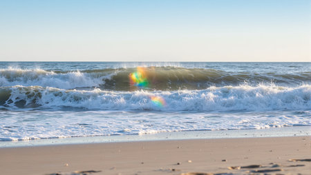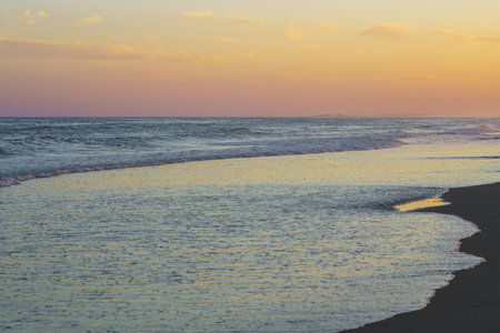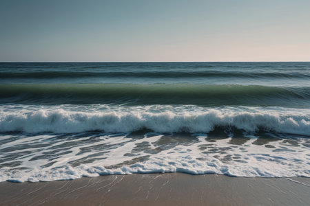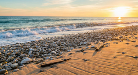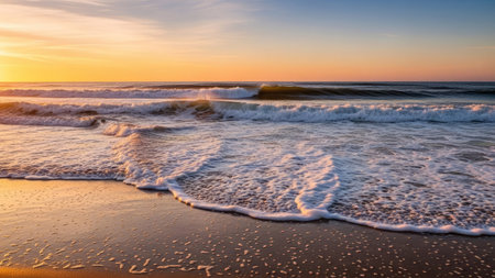 Experience the calm beauty of ocean waves rolling onto a sandy beach at sunrise, creating a serene and tranquil atmosphere in this picturesque coastal landscape.