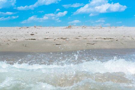 Sunny day on the beach. Wide sandy beach, beautiful blue sea, seagull, and cloudy sky on background