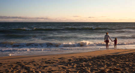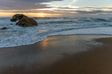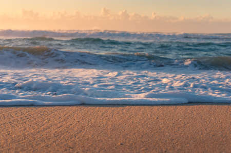 Close up of sandy beach shore with white foam of ocean waves and sunrise, sunset. Tranquil summer holiday background