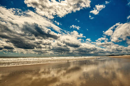 A wide angle view of a beautiful sandy beach with a lovely blue cloudy sky above at Pawleys Island, South Carolina, USA.