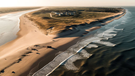 Aerial view of sand dunes and ocean waves on the beach.