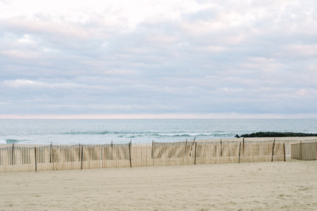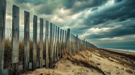 Serene seascape showcasing beach sand dunes and fence against a backdrop of dramatic clouds