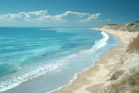 Beautiful seascape with sand dunes and blue sea.