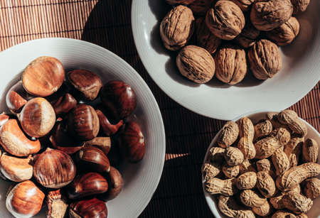 Top view of various fresh nuts placed in ceramic bowls on bamboo mat in daytime