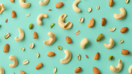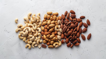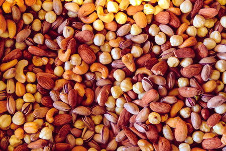 Assorted mixed nuts background, featuring almonds, cashews, pecans, walnuts, and hazelnuts. Healthy snack concept with natural textures and colors.