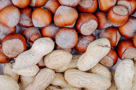 top view of mixed nuts in shell hazelnuts and peanuts on white background