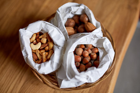 Top view Various sort of nuts on the table in a paper bag on wooden background, shopping grocery concept, nuts delivary, Zero Waste Food Shopping. Copy space.