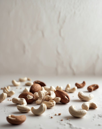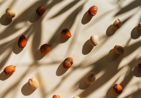 Aesthetic arrangement of assorted nuts scattered on a light background, with playful shadows from palm leaves creating a textured look