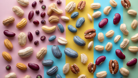 A colorful arrangement of various nuts on a light beige background, showcasing a diverse selection of textures and shapes