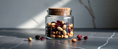 AI Generated. Glass jar with cork lid filled with mixed nuts and dried cranberries on marble surface