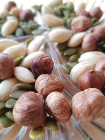 Hazelnuts in a transparent plate on the background of a scattering of various nuts close up
