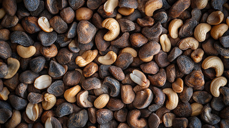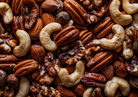 Close-up shot of mixed nuts, featuring a variety of textures and shapes including cashews, walnuts, pecans, and almonds