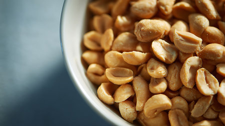 Detailed close-up shot displaying a heap of shelled, roasted peanuts inside a white bowl. The bowl is positioned on a smooth, gray surface, creating a balanced composition.