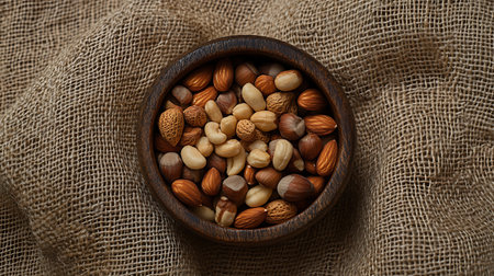 Close-up shows an assortment of almonds, cashews, and hazelnuts in a rustic wooden bowl, against a background of textured burlap. Nutrient-rich and visually appealing.