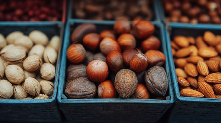 A vibrant collection of various nuts is beautifully arranged in rustic baskets, highlighting the textures and colors of each type, perfect for healthy snacking.