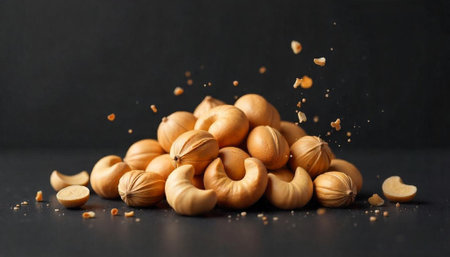 Close-up macro of roasted nuts showing rich texture and warm tones. Shallow depth of field highlights details, perfect for food, snack, and culinary