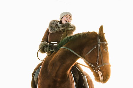 Close-up portrait of a beautiful girl in a brown coat riding a horse in the autumn park