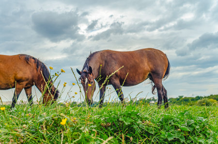 Majestic graceful brown horses in meadow field. Tranquil countryside scene.