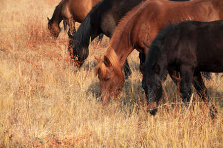 Horses pasturing in the steppe. Natural light and colors. Shallow depth of field for natural view